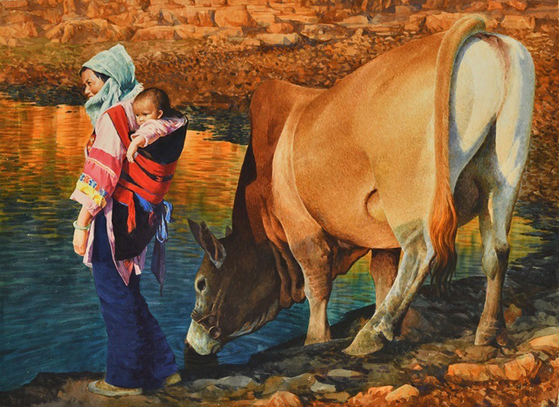讲座内容分三部分:第一部分胡晓幸作品欣赏,一共大约六十多张画作,题材涵盖人物、动物、风景等。内容从乡村美景到百姓生活,从一跃而起的大黄牛到头顶阳光白发老人,随即转向小孩子清澈透亮无邪的眼神。作品中人物形象生动,朴实、灵动,有着浓郁的地域风情。牛的造型强劲有力,形态地域特色分明,眼光中充满人类喜怒哀怨的情感,时而刚劲、时而柔和,时而愤怒、时而幽怨给观者留下深刻影响。