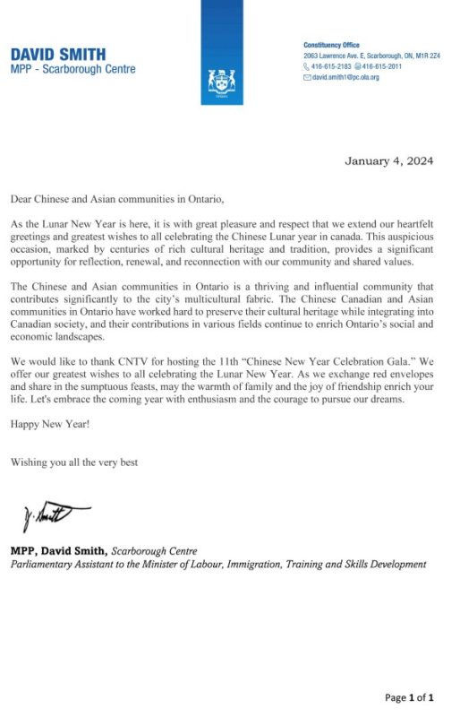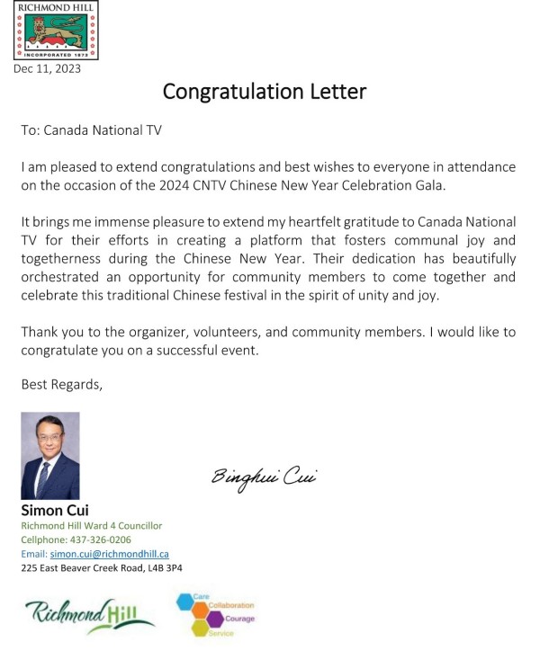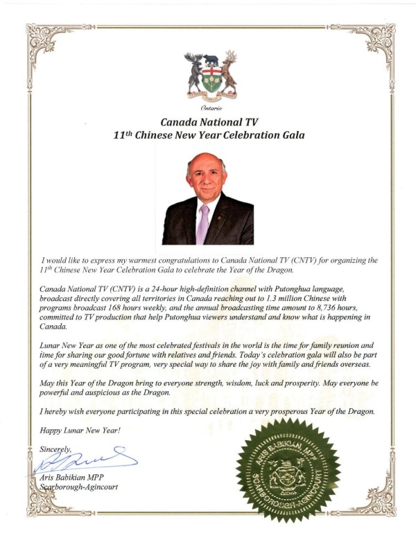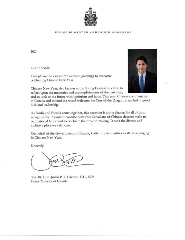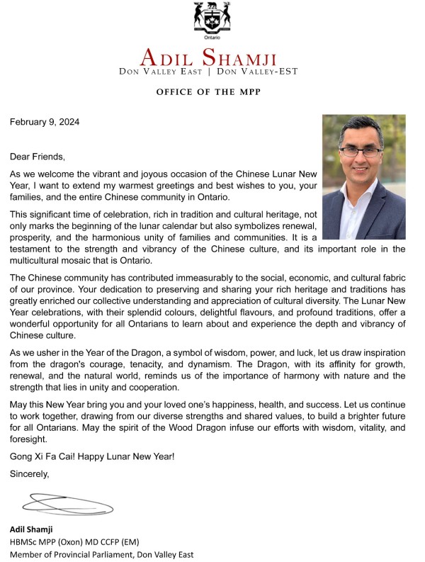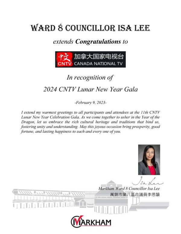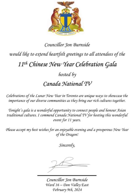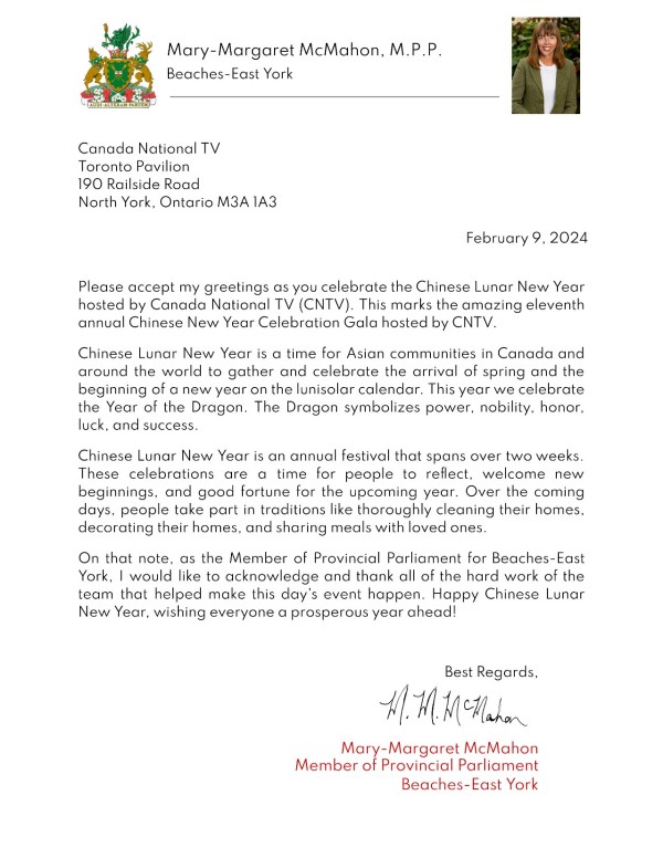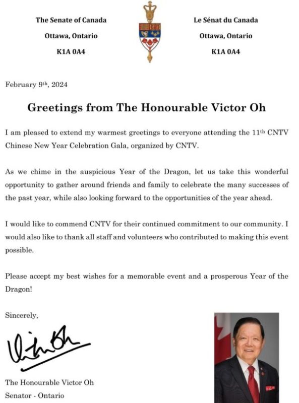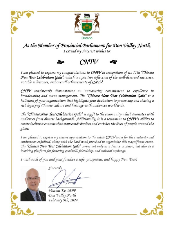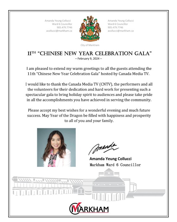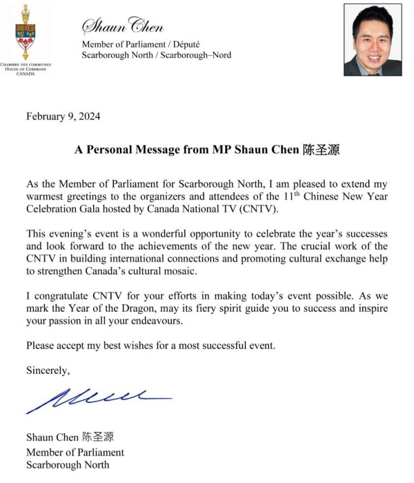 国会议员陈圣源带来了总理给华人朋友的拜年贺信,发来贺信的还有Beaches-East York 安省省议员 Mary-Margaret McMahon, 多伦多市议员Don Valley East- Jon Burnside,万锦市议员MARKHAM WARD 6 COUNCILLOR AMANDA YEUNG COLLUCCI,他们为华人华侨送上了新春的祝福。