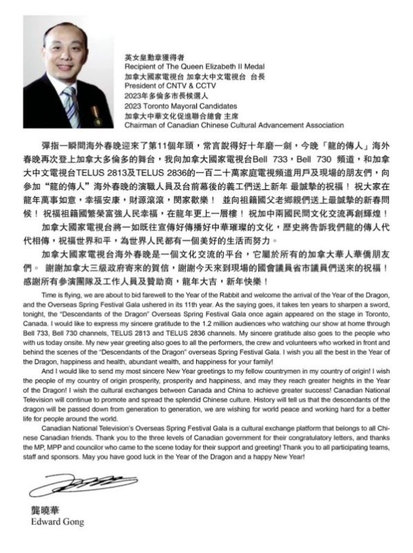 2024海外春晚的主题是“龙的传人”,晚会上加拿大国家电视台台长,2023年多伦多市长候选人龚晓华先生给海内外的华人华侨拜年,给祖籍国的父老乡亲拜年!祝愿电视机前和现场的观众朋友们龙年大吉,如意安康!并表示电视台愿意继续为中西文化的交流和中华文化的传播做出积极贡献。同时龚晓华先生也回答了大家关心的大选问题,他讲自己参选的初衷是为了华人发声,希望能有更多的华人朋友参政议政,进一步提高华人华侨的地位。