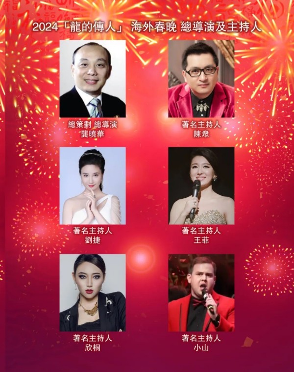 2024“龙的传人”海外春晚主持人(左至右):小山David, 欣桐,陈众,王菲,刘捷