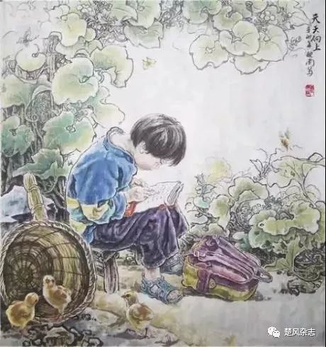 曾经偶尔看到过一幅唐映南先生的工笔画《天天向上》,画的是一个乡村孩子在农家小院里认真学习的场景。也许是刚刚放学回来,忙完农活,孩子就坐在一条小板凳上抓紧做作业,孩子低着头,很认真。四周是瓜藤叶子缠绕,花叶盛开,农具还放在一旁,几只小鸡在脚边走动,浓郁的乡土气息扑面而来,多象我以前看到过的无数乡村图景啊!这样的画作很容易就勾起人心底的柔软乡愁。