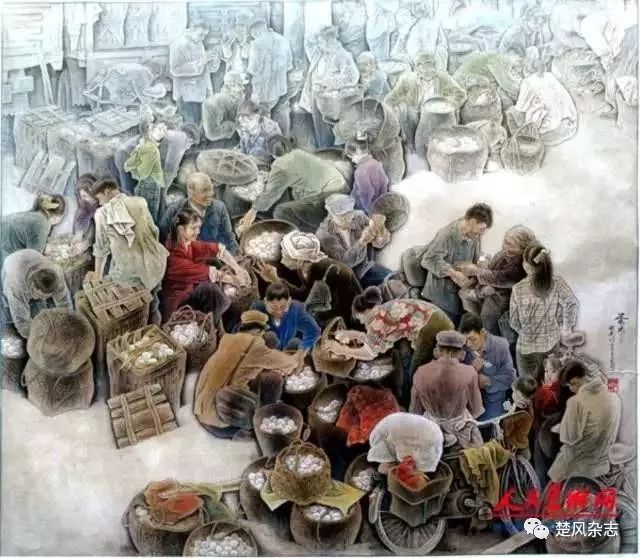 还有一些画面比较开阔的,比如《蛋市》,蛋市即湘乡谭市镇,1980年代曾经是中部地区重要的鸡蛋交易市场,各色人物在这里交易、交集,《蛋市》将这一场景描绘下来,一幅典型的改革开放初期的集贸市场风俗画;还有《苗寨的笑声》,画的是苗寨的乡亲们看电影时笑得前伏后仰的快乐场景,里面人物众多,每一个都栩栩如生。