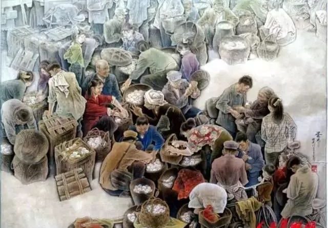 还有一些画面比较开阔的,比如《蛋市》,蛋市即湘乡谭市镇,1980年代曾经是中部地区重要的鸡蛋交易市场,各色人物在这里交易、交集,《蛋市》将这一场景描绘下来,一幅典型的改革开放初期的集贸市场风俗画;还有《苗寨的笑声》,画的是苗寨的乡亲们看电影时笑得前伏后仰的快乐场景,里面人物众多,每一个都栩栩如生。