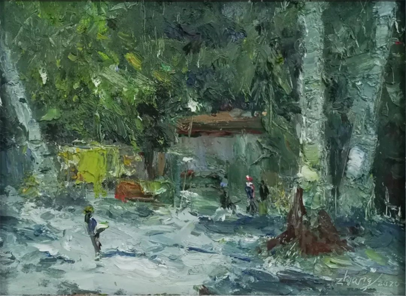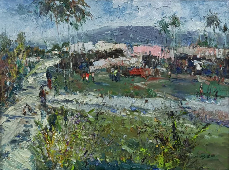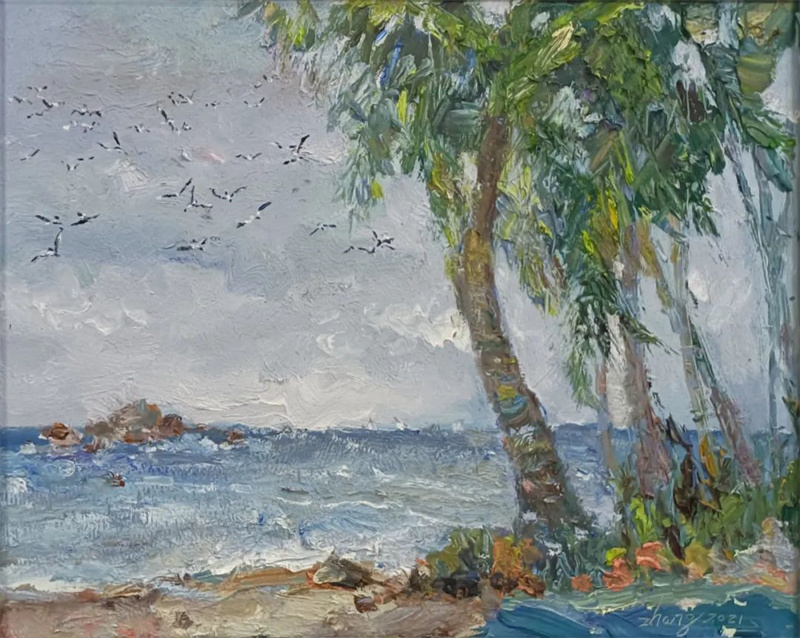 我昰2004年从武汉来到海南海口,在高校任教,乐于与海南本土画家交流。在海南省南海油画院主办,蓝色视觉绘画艺术中心承办《绿色浪漫油画展》开幕式上,我幸会画家张建雄。他一脸热情的笑意,穿一身整洁朴素的衣着,当场自信地挥舞画笔,挥洒着夏的火热,春的温柔,秋的丰硕,冬的冷峻。他是海南省海口市人,见惯了海岛的台风,追求闲庭信步般的浪漫,具有情满家乡海南岛的情怀,这是他的画作给我的感觉。