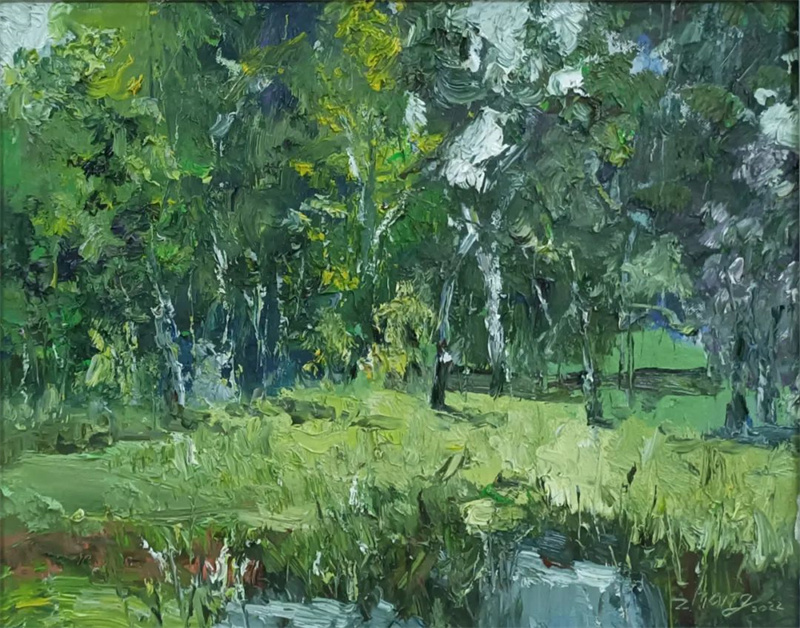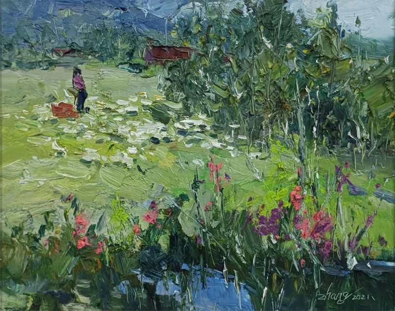 张建雄既画国画,又画油画,于是,他的油画有中国诗词书画追求的意境,而他的国画也具有油画的色彩构图形成的立体视觉。张建雄的南方太阳系列国画,他的花鸟山水国画,大笔写意与工笔描绘结合,绿叶青翠欲滴,红花纯洁典雅,形态各异,姿态优雅,构建了一种意境美。我们知道,中国书画艺术的精神,主要集中体现在气韵的表达及意境的创造上。追求气韵表达和意境创造之美,是中国书画艺术家的精神追求,也是张建雄的事业目标。张建雄认为,中国艺术美学,应该注重作品的气韵和神采,强调艺术创作与自然认知结合,注重生态文化意识与生命的感悟。当年,张建雄就读于北京大学艺术学院,这为他进行美术创作,奠定了坚实的理论基础。现在,张建雄在国画创作上,有自己的独到见解,能独辟蹊径。在油画创作上,他有自己的不凡建树,彰显才华。