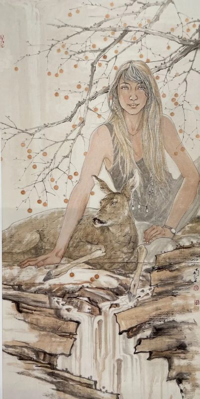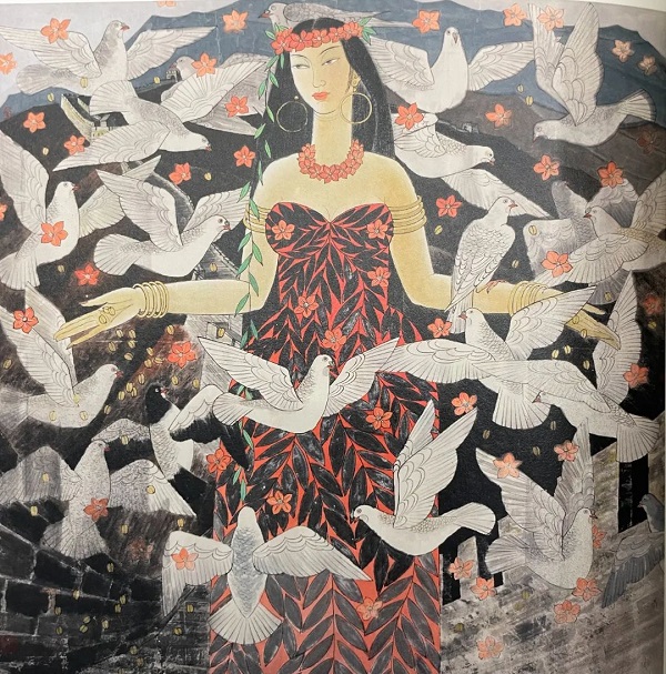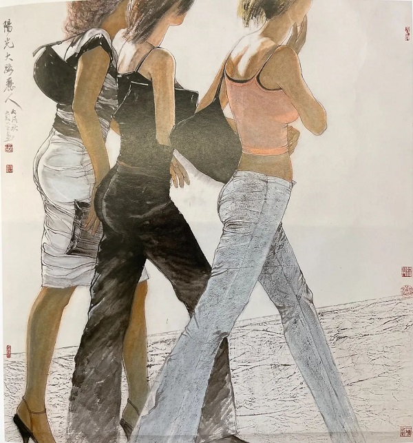 在美术门类中各有“道”“理”和“法”,如能融各类之精华而汇施于一艺,必有新的发现和创造,富有多才艺的南平当他专事国画创作时,综合的艺术素养使他在水墨山水、花鸟尤其是人物画创作中,运用综合的艺术语言塑造具有时代性和时尚意趣的人物形象,尤以百态千恣的女性为最。这个世界如果没有女人就没有了阳光,南平画过一幅《阳光大路丽人》,画面构图单纯而奇特,只描绘三位快步行进的、体态修长苗条的年轻女子,衣着藏露得体大方,画家并不着意于人物面部表情的刻画,而将头部和脚伸出画外,以不同的行走姿态体语隐现人物的共性和个性,不着笔墨的单纯背景更衬托出人物形态;造型语言也是单纯中又见丰富;运用线描和明暗法塑造平面中见光色体积感,质感和空间感。走在前面的女子牛仔裤那种青灰色质,用轻微皴擦、疏密有致的线条组合,平涂中隐现微妙的体积感,下笔果断、大胆,肯定恰到好处,女子的上身沐浴在阳光下,和着背景的色调使整个画面充满阳光、青春和生命活力,很符合“阳光丽人”这一画的主题,就这一幅画本身体现了画家刘南平的中西两种画理画法的天衣无缝的结合、融合,中国书法与用笔用墨和用色融合自然书写形象,画法既有自身的语言美更见形象美。这幅画之所以动人、耐人寻思寻味处甚多,这源自画家在现实生活中受感动而动情所作,在这幅画边画家有段旁白:“久居都市,常惊艳当代女性朝气勃发,新潮时尚,听她们的足音,看她们走进阳光。”道出了这幅画的朝气向上和谐奋发的时代精神与新潮时尚的时代社会特点。一幅画反映一个时代是画家思想水平艺术综合素养的高度概括体现。