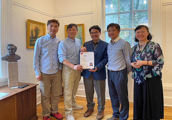 约克区议员何胡景为画展送贺信与画家邓竞、 常在盛、 赵峻、主办方负责人于多合影