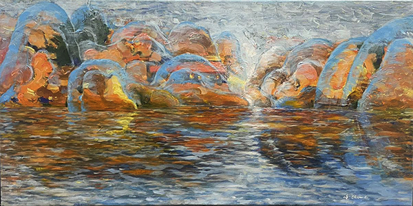 加拿大中国美术家协会副主席章天柱分享了他对三位画家作品的看法。他认为,尽管三位画家的风格各异,但他们的作品在内核上是一致的,都蕴含着共同的“东方情怀”,通过作品表达了他们对世界的感受以及灵魂的呼吸。他特别指出,在这场展览中,三位画家都是主角,缺少任何一人,整体的和谐与“韵”的丰富与饱满,就无法完整呈现。就如海明威在《丧钟为谁而鸣》首卷中提及的”任何一个缺失都会影响整体的完滿”。最后章天柱还特别评价了画家赵峻的作品《故国神话》,认为作品中的传统色彩和线条将山水形态充分释放,增强了画面的延展性和张力,呈现了中国神话的意境。作品看似随性,却充满梦幻般的氛围,将观者带入了一个全新的世界。