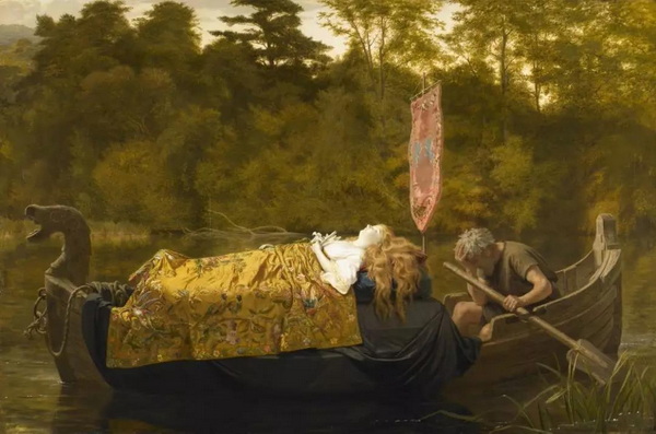 藏于英国利物浦 沃克艺术画廊 背景:取材自丁尼生《国王的田园诗》,讲述英国传说中亚瑟王和他的圆桌骑士。伊莱恩爱上了圆桌骑士之一的兰斯洛特(Sir Lancelot),但他爱的是王后格尼薇尔(Guinevere)。伊莱恩在单相思中死去,她忠实的哑仆遵照遗嘱,将她的遗体送去给兰斯洛特。利物浦市议会在1871年的秋季展购得,这也是公开藏馆第一次购买的女性艺术家作品。