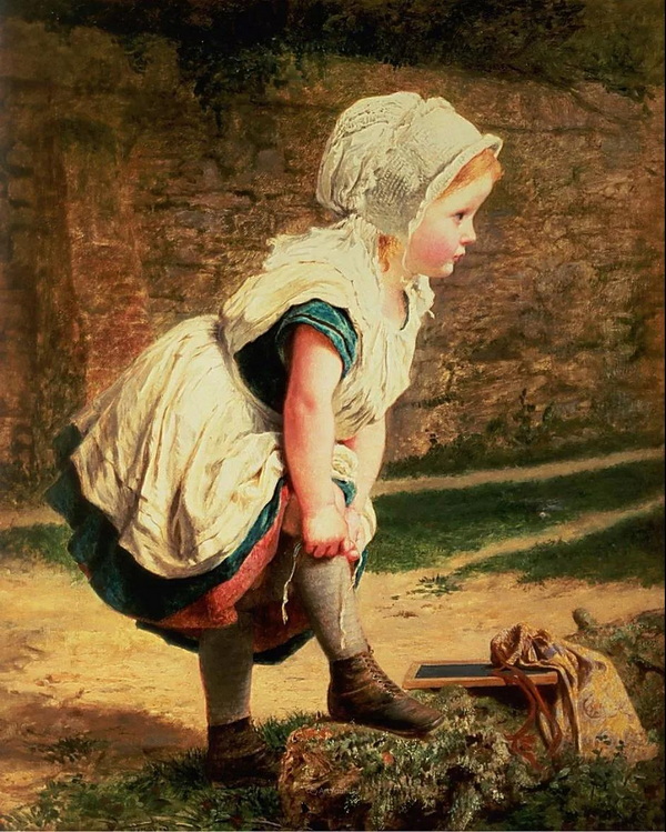 赏析:一群乡村孩子们在空地上玩耍。从最近处小男孩破旧的袜子可知他们都出生贫寒,中间的女孩们正津津有味地分享一本儿童读物,后面的一个小女孩带着自己的弟弟妹妹们,俨然一副家庭主妇小保姆的样子。虽然贫穷,他们仍然非常快乐。越是加快工业革命现代化进程的年代,这种单纯的愉悦越是可贵。
