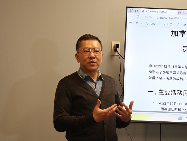 现任会长刘征首先做了2023-24年度工作总结:自2022年12月11日第五届理事会选举产生以来,在过去两年多的时间里,理事会全体成员凝心聚力,倾力付出,紧密围绕服务会员的核心目标,在全体会员的大力支持下,先后组织了25场丰富多彩的文化、艺术活动,包括纽约艺术周参观活动、滑铁卢古玩行参观活动;邦瀚斯(Bonhams)拍卖行西岸亚洲艺术负责人汤雅涵、中贸圣佳拍卖公司总经理薛世清团队等关于艺术品市场的公益讲座活动;各专项收藏如潘春芳教授的紫砂壶、艺术家张桐人的面塑、以及瓷器、书画、钱币、珠宝、首饰、沉香、铜炉、紫砂、砚台等鉴赏交流活动。其中第四届国际文化艺术节在加拿大政府资金的支持下,以“重聚·传承”为主题,邀请数十位加拿大本地艺术家(包括加拿大七人画派传人)、中国国家级工艺美术大师,雕漆大师殷秀云、花丝镶嵌大师袁长君、掐丝珐琅大师熊松涛和加拿大土著艺术家参加,几十种类的精美展品吸引了近千人参观。艺术节取得了令人满意的效果,扩大了基金会的影响力和知名度。随后刘征做了第五届理事会财务报告,向会员通报了基金会良好的财务状况。