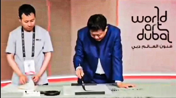 在2025迪拜世界艺术博览会上,中国作为主宾国隆重亮相,汇聚三十余家画廊及近百位知名艺术家,共同打造一场融合传统与现代、静态与动态、东方与世界的艺术盛宴。展会期间,现场表演与学术研讨交替进行,杨栓明现场书法挥毫展现汉字之美,共同艺术中心(Common Art Center)深时美术馆 (Deep Time Art Gallery)用极具东方当代艺术审美的作品,展现当下中国当代艺术之特殊材料、东方美学与国际视觉的碰撞。越剧、瓷器、茶艺、香道及最后中央舞台心韵疗愈( HeartVibe)艺术表演在细腻与意境中流露出中华文化的深厚底蕴。