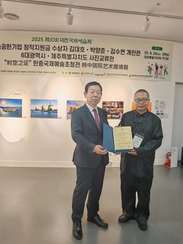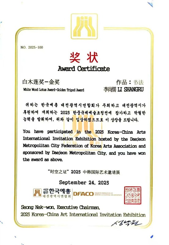 (《国际艺术新闻网》据中国《华侨传媒网》2025年10月9日消息)金秋九月,韩国大田国际艺术节的舞台上,一抹来自中国的东方气韵格外引人注目。中国传统文化的传承者与传播者——李尚儒,凭借深厚的文化修为与卓越的艺术成就,载誉归来。这份荣誉,不仅是对他个人艺术与学术探索的高度肯定,更是中韩文化交流与民心相通的生动见证,让中华优秀传统文化的温润光芒,在国际艺术殿堂中静静流淌、熠熠生辉。